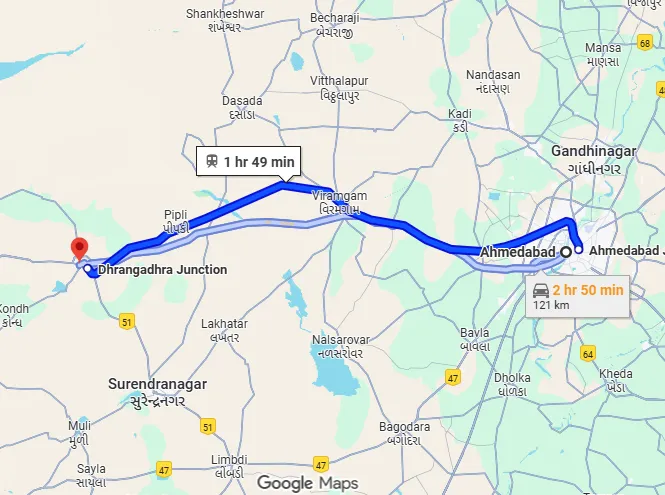 The distance from Ahmedabad to Dhrangadhra is approximately 130 km, and it takes around 2.5 to 3.5 hours by car, depending on the route and traffic. The most preferred route is via NH47, passing through Sanand, Viramgam, and Halvad, offering a smooth highway experience.
