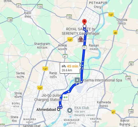 The Ahmedabad to Gandhinagar distance is around 30 km, and it takes just 40 to 50 minutes to travel by cab. The route via NH147 Expressway is well-maintained and provides a seamless driving experience. Along the way, you can enjoy views of urban Ahmedabad transitioning into the peaceful greenery of Gandhinagar.