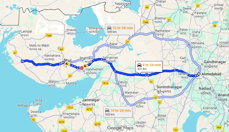 The distance from Ahmedabad to Naliya is approximately 445 km, and the drive takes around 8 to 9 hours via NH947 and NH41. The route passes through Sanand, Dhrangadhra, Bhachau, and Nakhatrana, offering scenic rural landscapes and well-maintained roads.
