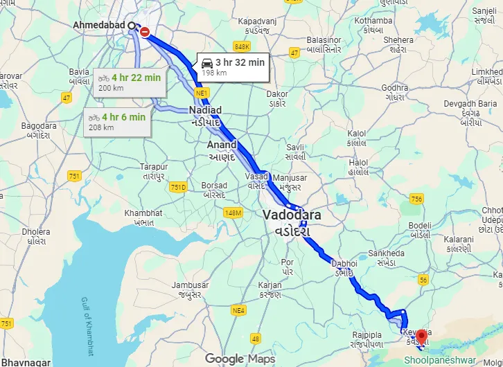 The road distance between Ahmedabad and the Statue of Unity is around 200 to 210 kilometers, depending on the selected route. Most travelers complete the journey in about 4 to 4.5 hours by car. The common route goes through Vadodara and continues toward Kevadia, offering a smooth highway drive with restaurants, fuel stations, and rest stops.